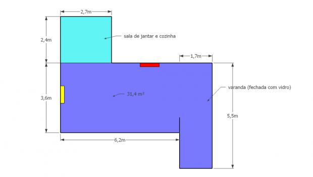 *** Teoricamente, a posição AMARELA seria a melhor, pois estaria acompanhando a maior dimensão da sala. Além disso, com as aletas verticais da unidade, eu conseguiria refrigerar a região VERDE, quando fosse necessário (abrindo a porta de correr). No entanto, a unidade ficaria a 8 metros da outra ponta da região AZUL. Não seria muito distante, prejudicando a refrigeração da varanda?